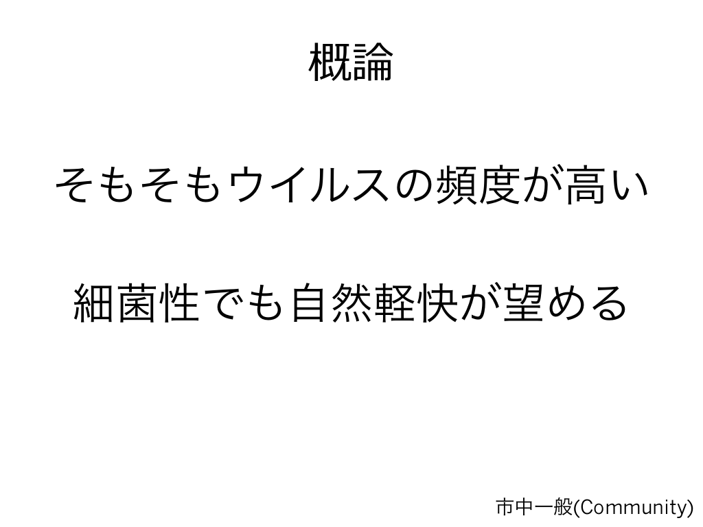 #11. 概論 そもそもウイルスの頻度が高い 細菌性でも自然軽快が望める 市中一般(Community)