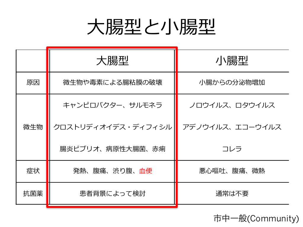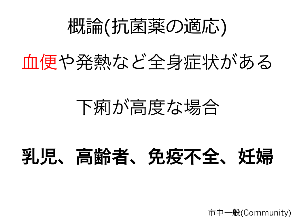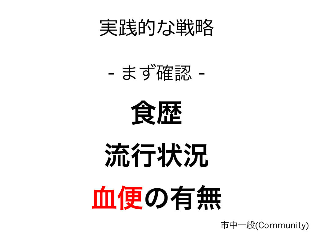 #44. 実践的な戦略 - まず確認 - 食歴 流行状況 血便の有無 市中一般(Community)