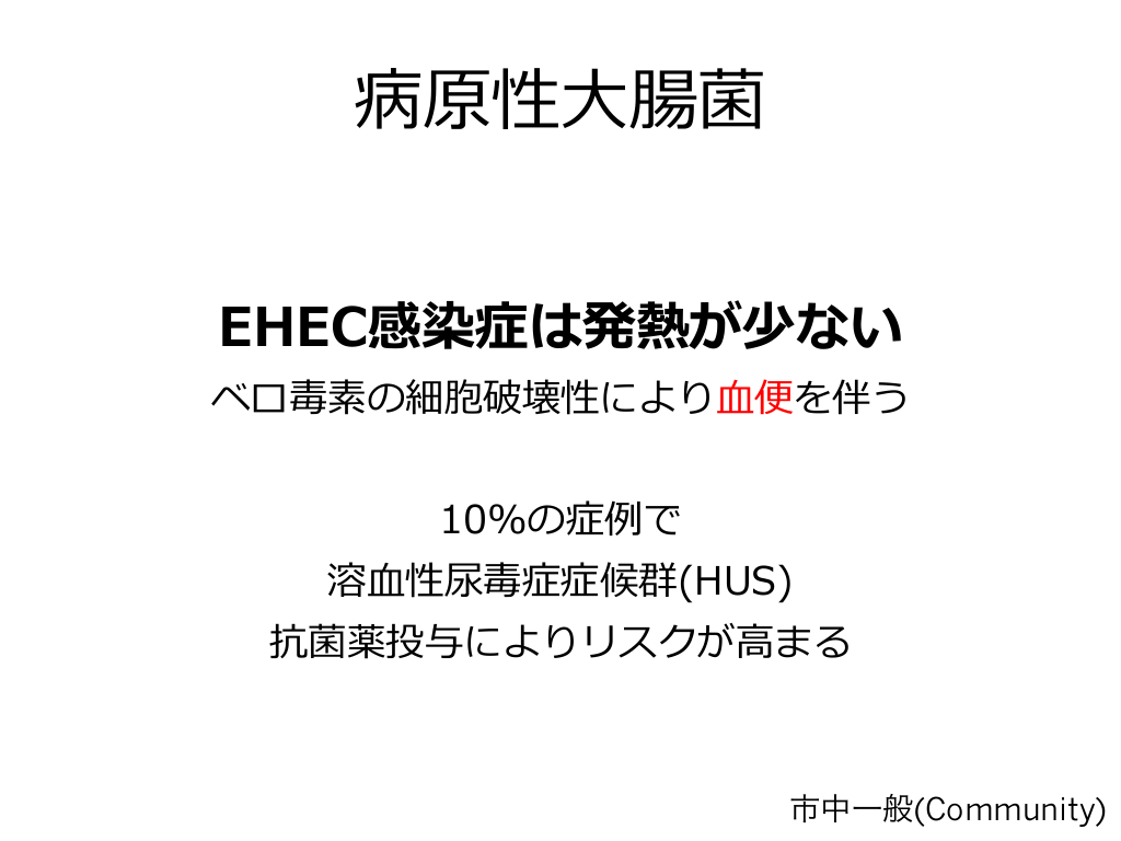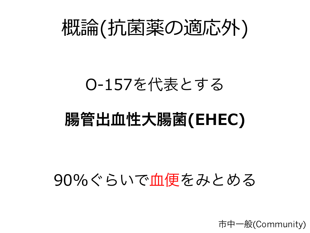#13. 概論(抗菌薬の適応外) O-157を代表とする 腸管出血性大腸菌(EHEC) 90%ぐらいで血便をみとめる 市中一般(Community)