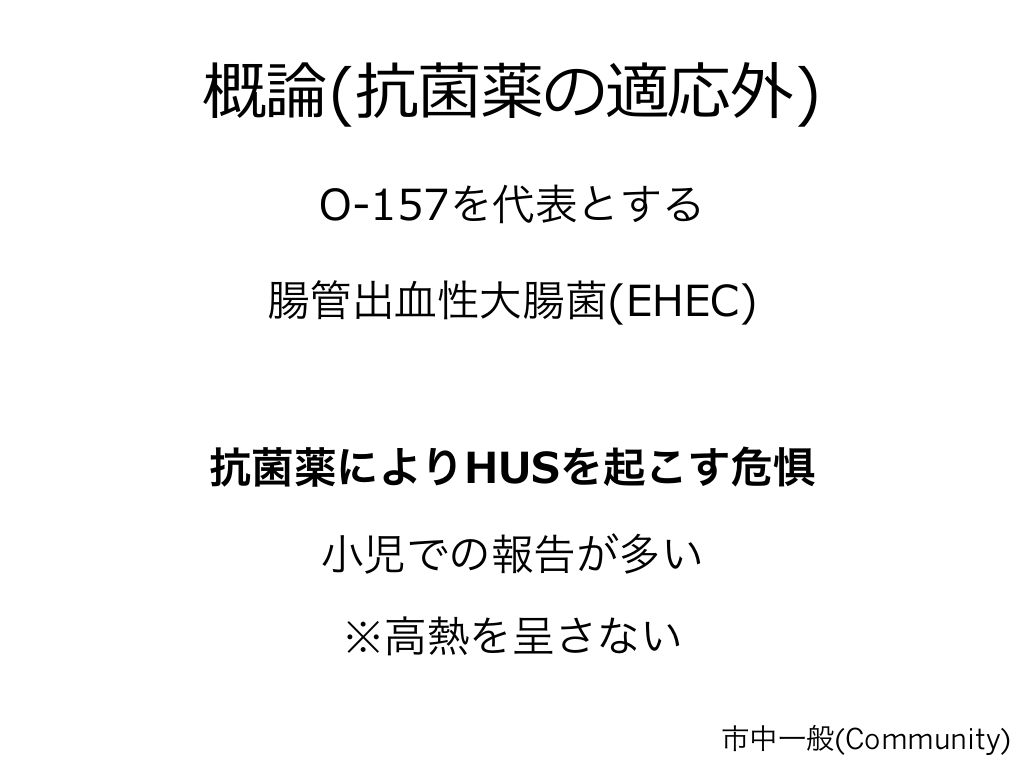 #14. 概論(抗菌薬の適応外) O-157を代表とする 腸管出血性大腸菌(EHEC) 抗菌薬によりHUSを起こす危惧 小児での報告が多い ※高熱を呈さない 市中一般(Community)