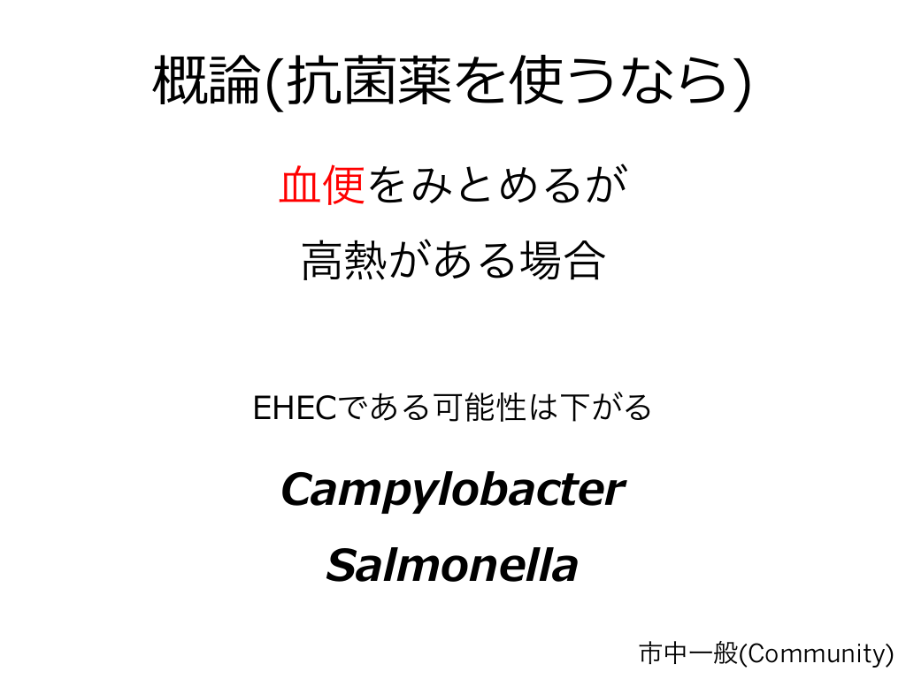 #15. 概論(抗菌薬を使うなら) 血便をみとめるが 高熱がある場合 EHECである可能性は下がる Campylobacter Salmonella 市中一般(Community)