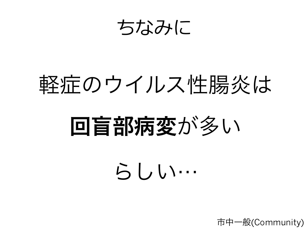 #18. ちなみに 軽症のウイルス性腸炎は 回盲部病変が多い らしい… 市中一般(Community)