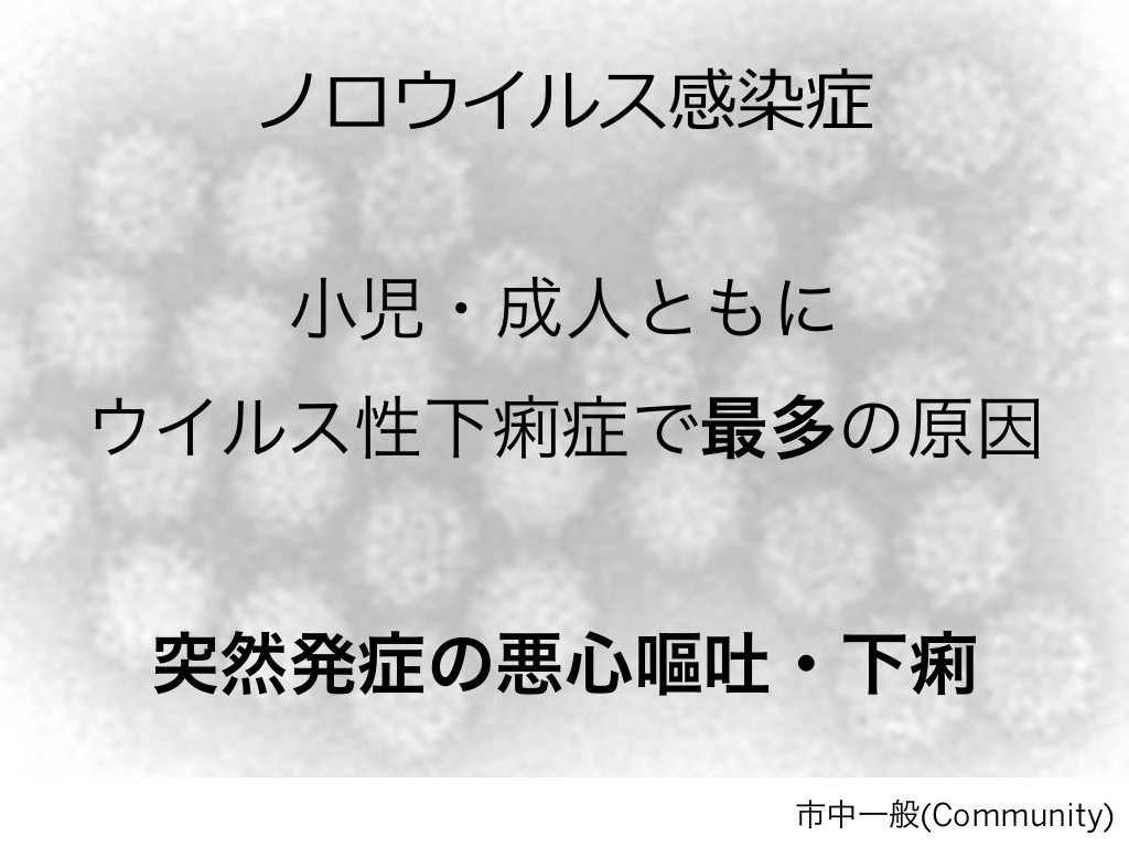 #19. ノロウイルス感染症 小児・成人ともに ウイルス性下痢症で最多の原因 突然発症の悪心嘔吐・下痢 市中一般(Community)