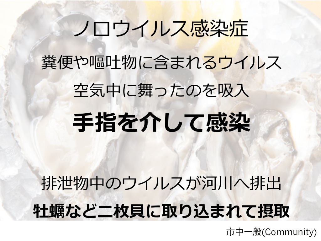 #20. ノロウイルス感染症 糞便や嘔吐物に含まれるウイルス 空気中に舞ったのを吸⼊ ⼿指を介して感染 排泄物中のウイルスが河川へ排出 牡蠣など⼆枚⾙に取り込まれて摂取 市中一般(Community)
