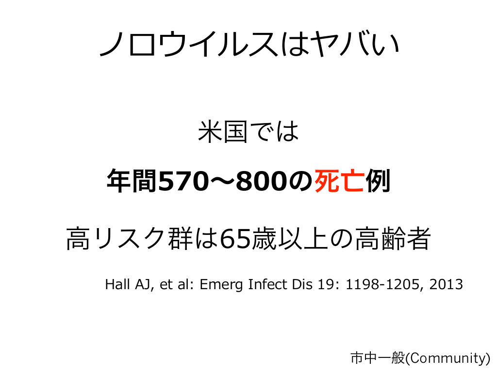 #21. ノロウイルスはヤバい 米国では 年間570〜800の死亡例 高リスク群は65歳以上の高齢者 Hall AJ, et al: Emerg Infect Dis 19: 1198-1205, 2013 市中一般(Community)