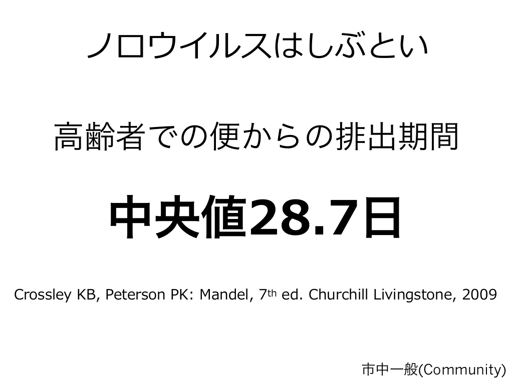 #22. ノロウイルスはしぶとい 高齢者での便からの排出期間 中央値28.7日 Crossley KB, Peterson PK: Mandel, 7th ed. Churchill Livingstone, 2009 市中一般(Community)