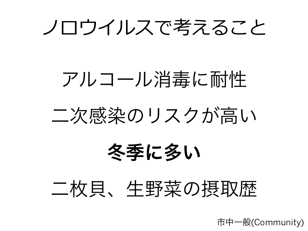 #23. ノロウイルスで考えること アルコール消毒に耐性 二次感染のリスクが高い 冬季に多い 二枚貝、生野菜の摂取歴 市中一般(Community)