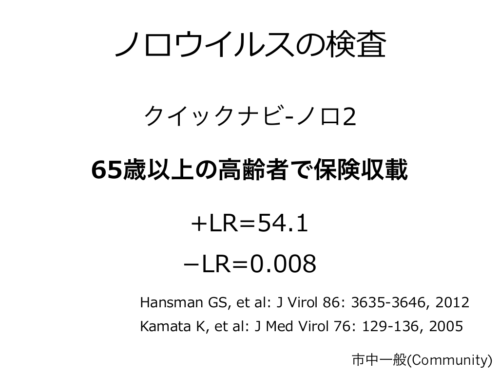 #24. ノロウイルスの検査 クイックナビ-ノロ2 65歳以上の高齢者で保険収載 +LR=54.1 LR=0.008 Hansman GS, et al: J Virol 86: 3635-3646, 2012 Kamata K, et al: J Med Virol 76: 129-136, 2005 市中一般(Community)