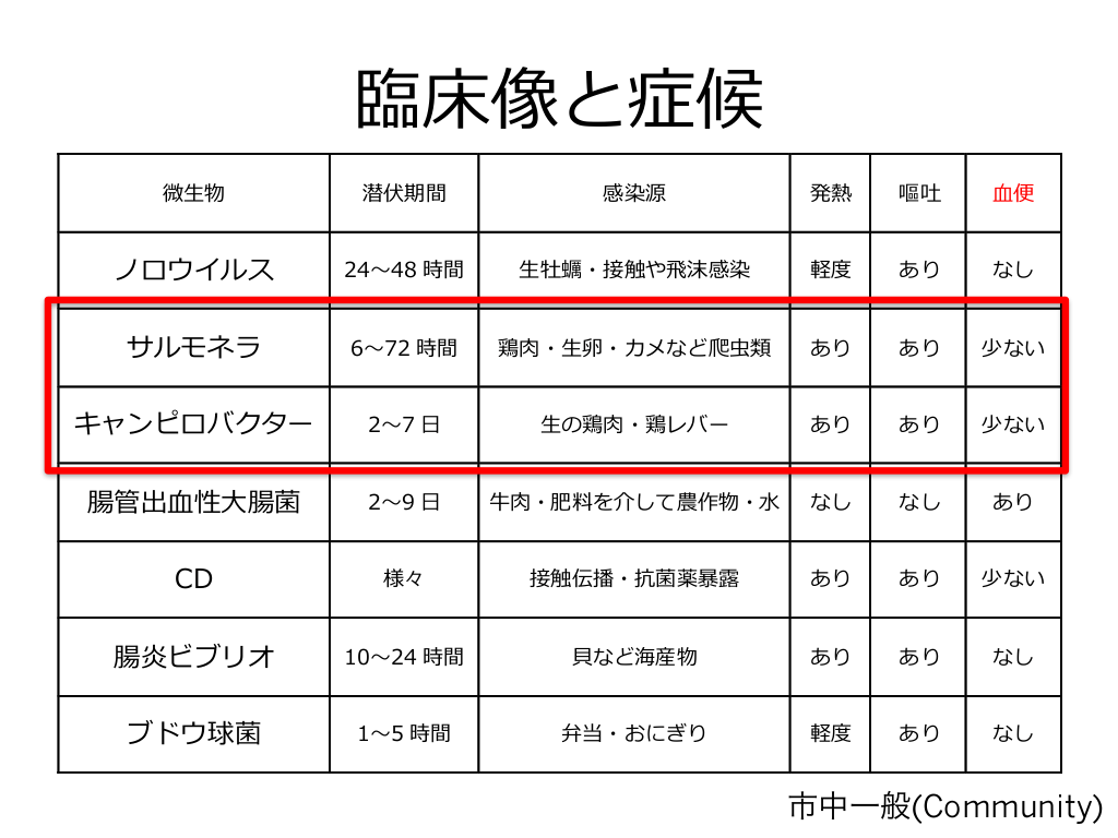 #25. 臨床像と症候 微⽣物 潜伏期間 感染源 発熱 嘔吐 ⾎便 ノロウイルス 24〜48 時間 ⽣牡蠣・接触や⾶沫感染 軽度 あり なし サルモネラ 6〜72 時間 鶏⾁・⽣卵・カメなど爬⾍類 あり あり 少ない キャンピロバクター 2〜7 ⽇ ⽣の鶏⾁・鶏レバー あり あり 少ない 腸管出⾎性⼤腸菌 2〜9 ⽇ ⽜⾁・肥料を介して農作物・⽔ なし なし あり CD 様々 接触伝播・抗菌薬暴露 あり あり 少ない 腸炎ビブリオ 10〜24 時間 ⾙など海産物 あり あり なし ブドウ球菌 1〜5 時間 弁当・おにぎり 軽度 あり なし 市中一般(Community)