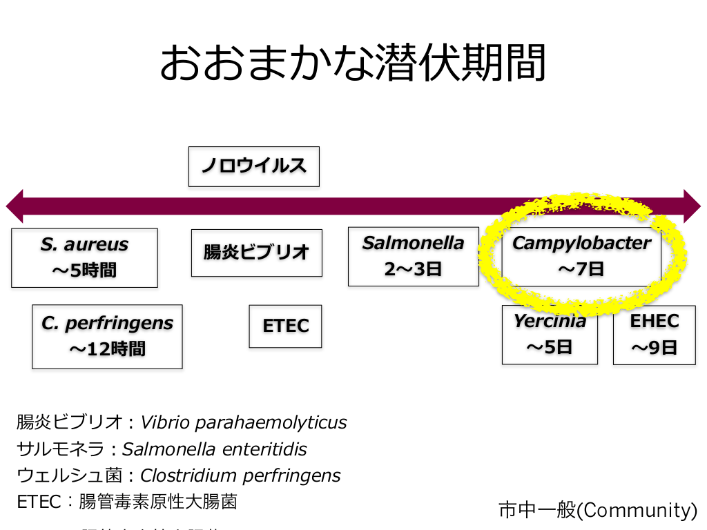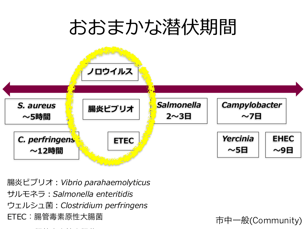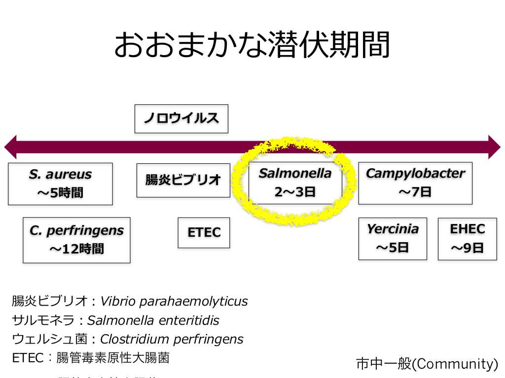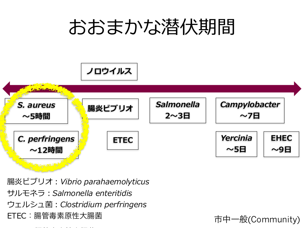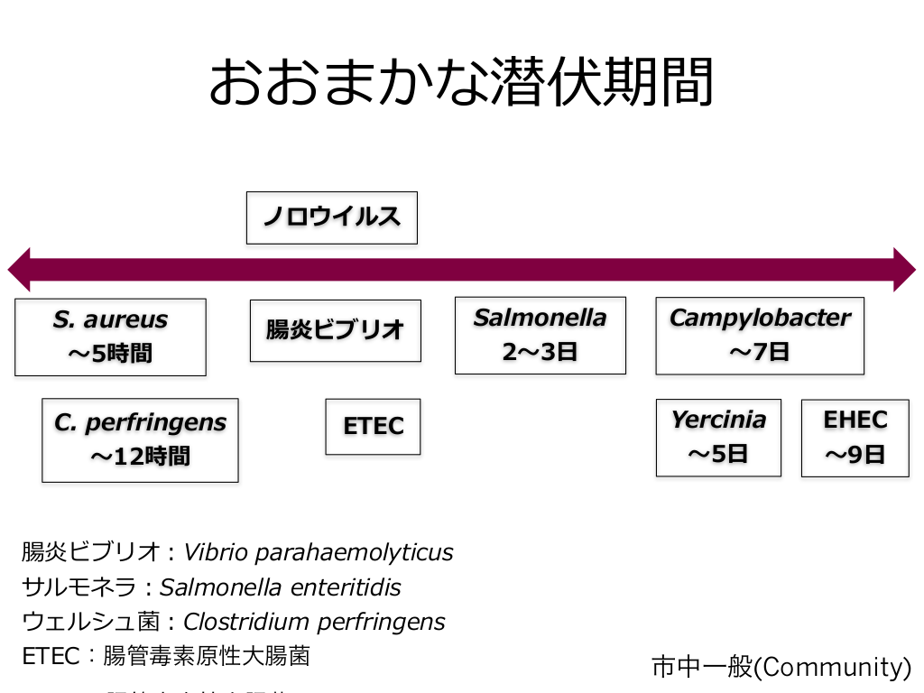 #30. おおまかな潜伏期間 ノロウイルス S. aureus 〜5時間 C. perfringens 〜12時間 腸炎ビブリオ ETEC Salmonella 2〜3⽇ Campylobacter 〜7⽇ Yercinia 〜5⽇ EHEC 〜9⽇ 腸炎ビブリオ:Vibrio parahaemolyticus サルモネラ:Salmonella enteritidis ウェルシュ菌:Clostridium perfringens ETEC:腸管毒素原性大腸菌 市中一般(Community)