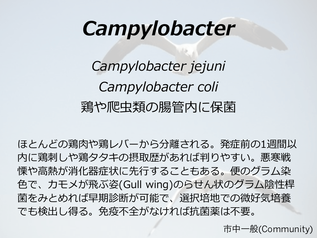 #31. Campylobacter Campylobacter jejuni Campylobacter coli 鶏や爬⾍類の腸管内に保菌 ほとんどの鶏⾁や鶏レバーから分離される。発症前の1週間以 内に鶏刺しや鶏タタキの摂取歴があれば判りやすい。悪寒戦 慄や⾼熱が消化器症状に先⾏することもある。便のグラム染 ⾊で、カモメが⾶ぶ姿(Gull wing)のらせん状のグラム陰性桿 菌をみとめれば早期診断が可能で、選択培地での微好気培養 でも検出し得る。免疫不全がなければ抗菌薬は不要。 市中一般(Community)