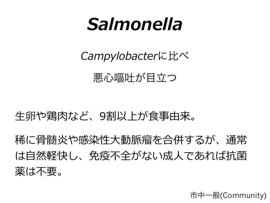 #32. Salmonella Campylobacterに比べ 悪心嘔吐が目立つ 生卵や鶏⾁など、9割以上が⾷事由来。 稀に⾻髄炎や感染性⼤動脈瘤を合併するが、通常 は⾃然軽快し、免疫不全がない成⼈であれば抗菌 薬は不要。 市中一般(Community)