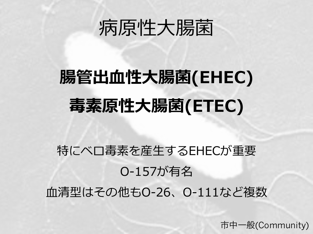 #33. 病原性⼤腸菌 腸管出⾎性⼤腸菌(EHEC) 毒素原性⼤腸菌(ETEC) 特にベロ毒素を産⽣するEHECが重要 O-157が有名 ⾎清型はその他もO-26、O-111など複数 市中一般(Community)