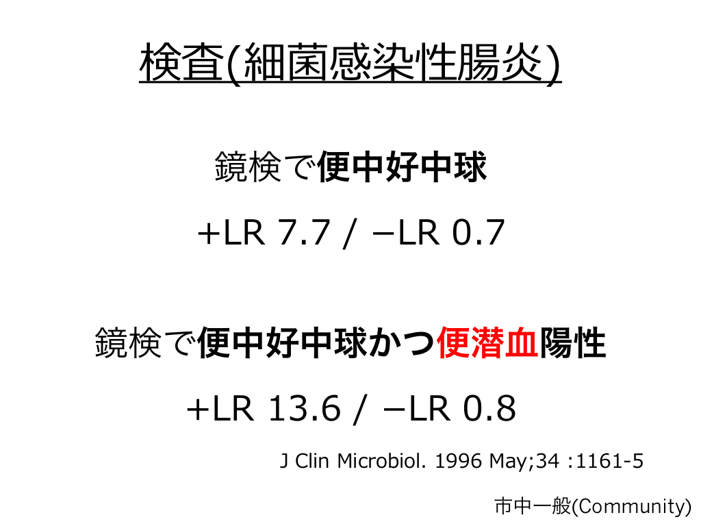 #35. 検査(細菌感染性腸炎) 鏡検で便中好中球 +LR 7.7 / LR 0.7 鏡検で便中好中球かつ便潜血陽性 +LR 13.6 / LR 0.8 J Clin Microbiol. 1996 May;34 :1161-5 市中一般(Community)