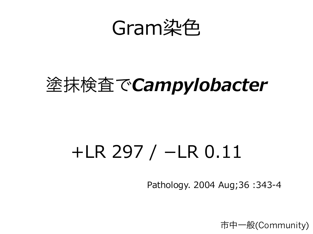 #36. Gram染⾊ 塗抹検査でCampylobacter +LR 297 / LR 0.11 Pathology. 2004 Aug;36 :343-4 市中一般(Community)