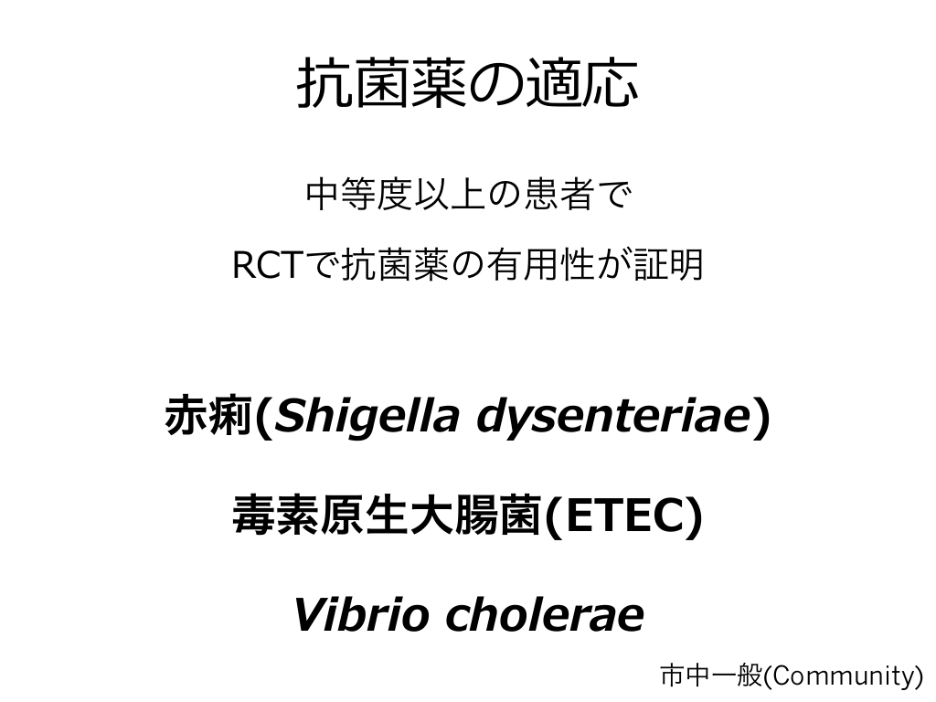 #37. 抗菌薬の適応 中等度以上の患者で RCTで抗菌薬の有用性が証明 赤痢(Shigella dysenteriae) 毒素原生大腸菌(ETEC) Vibrio cholerae 市中一般(Community)