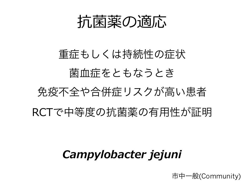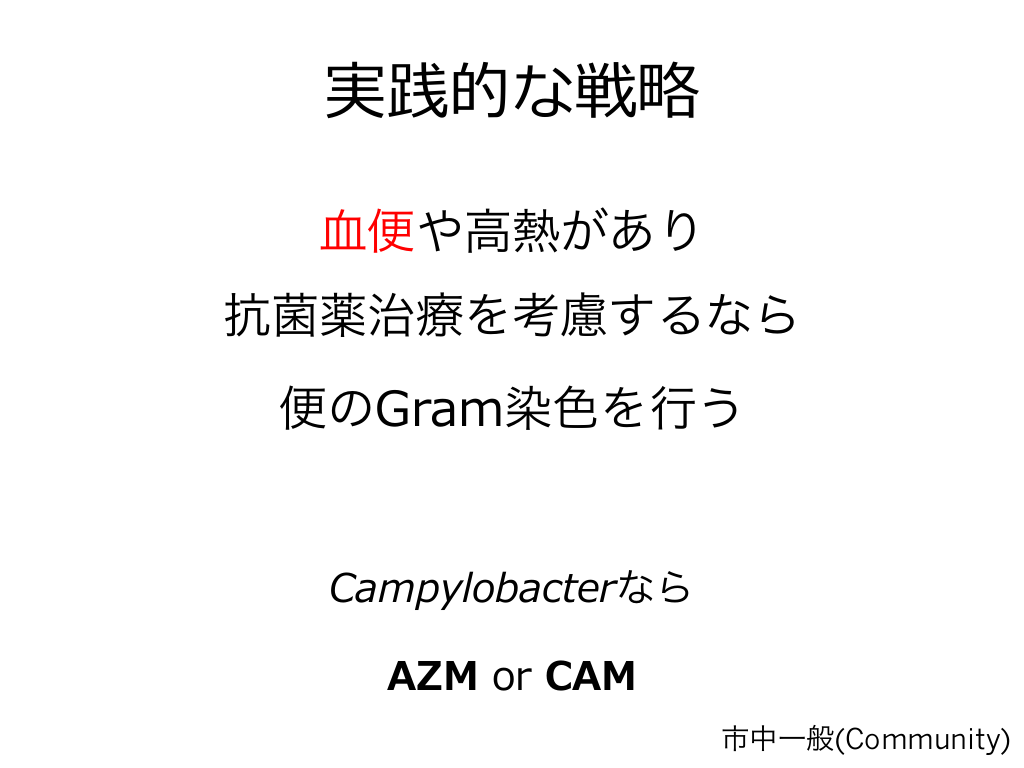 #46. 実践的な戦略 血便や高熱があり 抗菌薬治療を考慮するなら 便のGram染色を行う Campylobacterなら AZM or CAM 市中一般(Community)