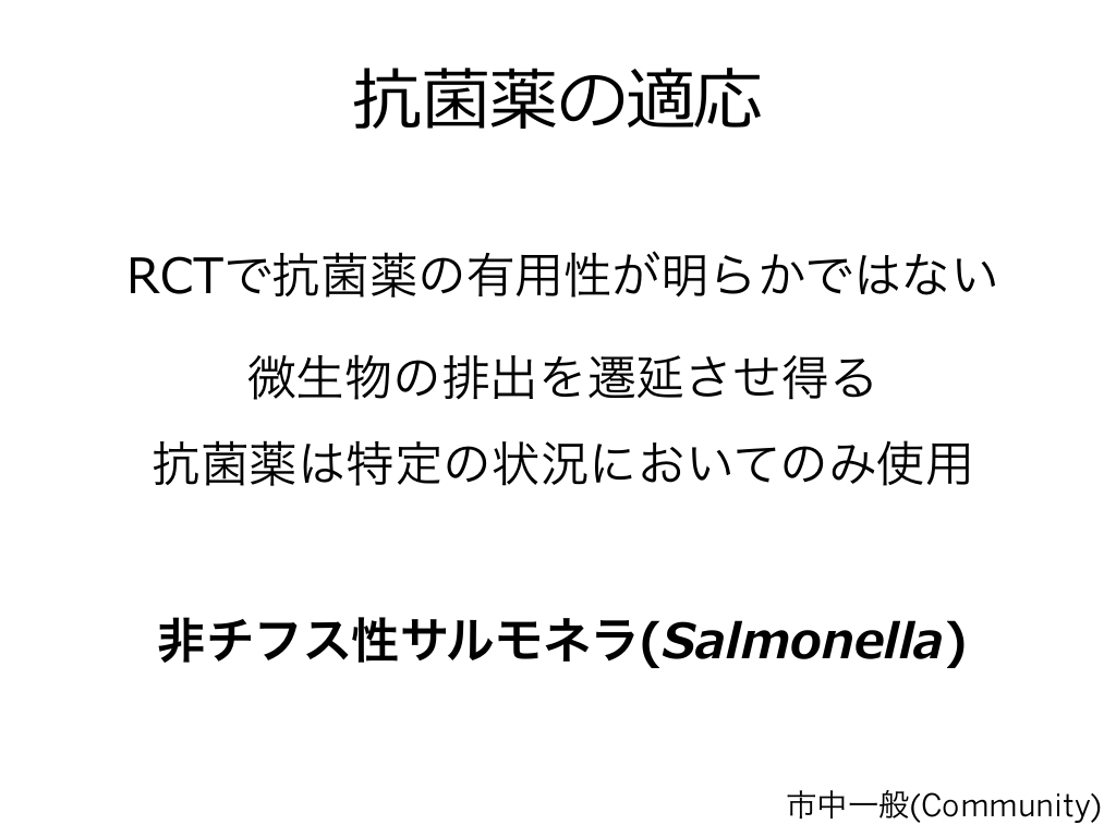 #39. 抗菌薬の適応 RCTで抗菌薬の有用性が明らかではない 微生物の排出を遷延させ得る 抗菌薬は特定の状況においてのみ使用 非チフス性サルモネラ(Salmonella) 市中一般(Community)