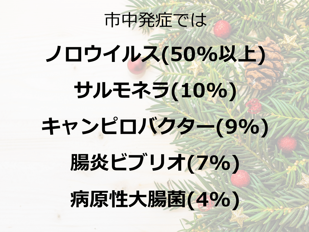 #4. 市中発症では ノロウイルス(50%以上) サルモネラ(10%) キャンピロバクター(9%) 腸炎ビブリオ(7%) 病原性⼤腸菌(4%)