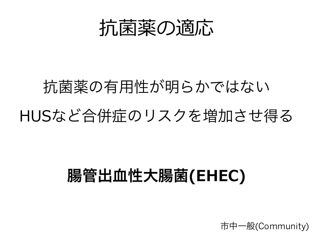 #40. 抗菌薬の適応 抗菌薬の有用性が明らかではない HUSなど合併症のリスクを増加させ得る 腸管出血性大腸菌(EHEC) 市中一般(Community)