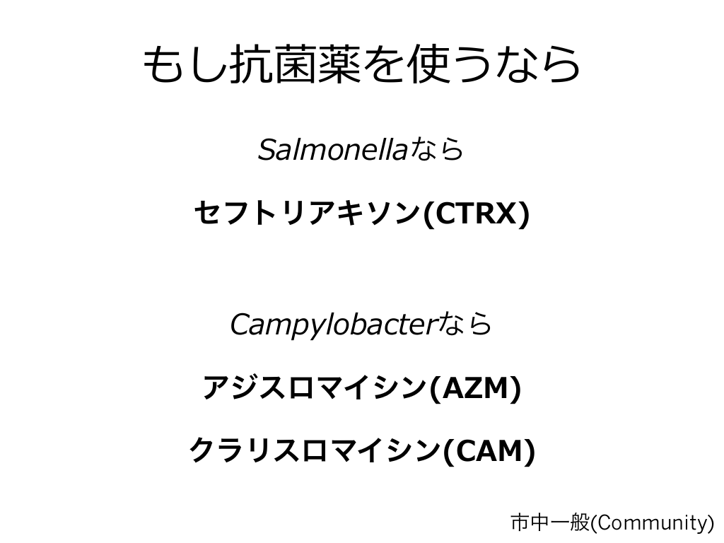 #42. もし抗菌薬を使うなら Salmonellaなら セフトリアキソン(CTRX) Campylobacterなら アジスロマイシン(AZM) クラリスロマイシン(CAM) 市中一般(Community)