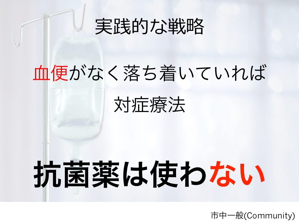 #45. 実践的な戦略 血便がなく落ち着いていれば 対症療法 抗菌薬は使わない 市中一般(Community)