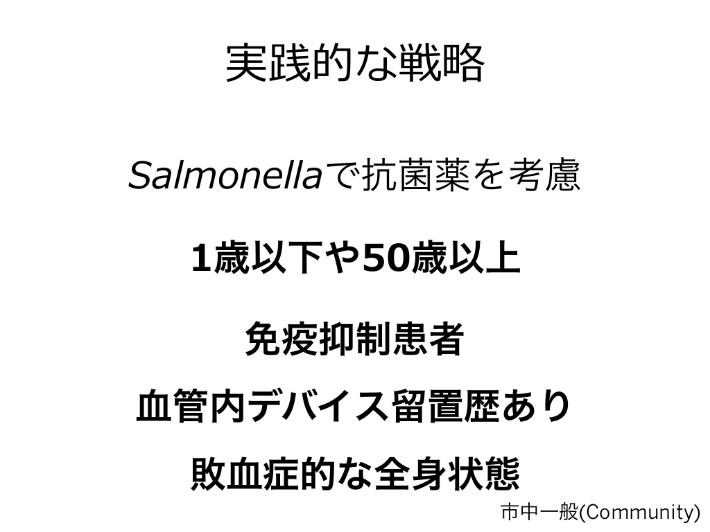 #47. 実践的な戦略 Salmonellaで抗菌薬を考慮 1歳以下や50歳以上 免疫抑制患者 血管内デバイス留置歴あり 敗血症的な全身状態 市中一般(Community)