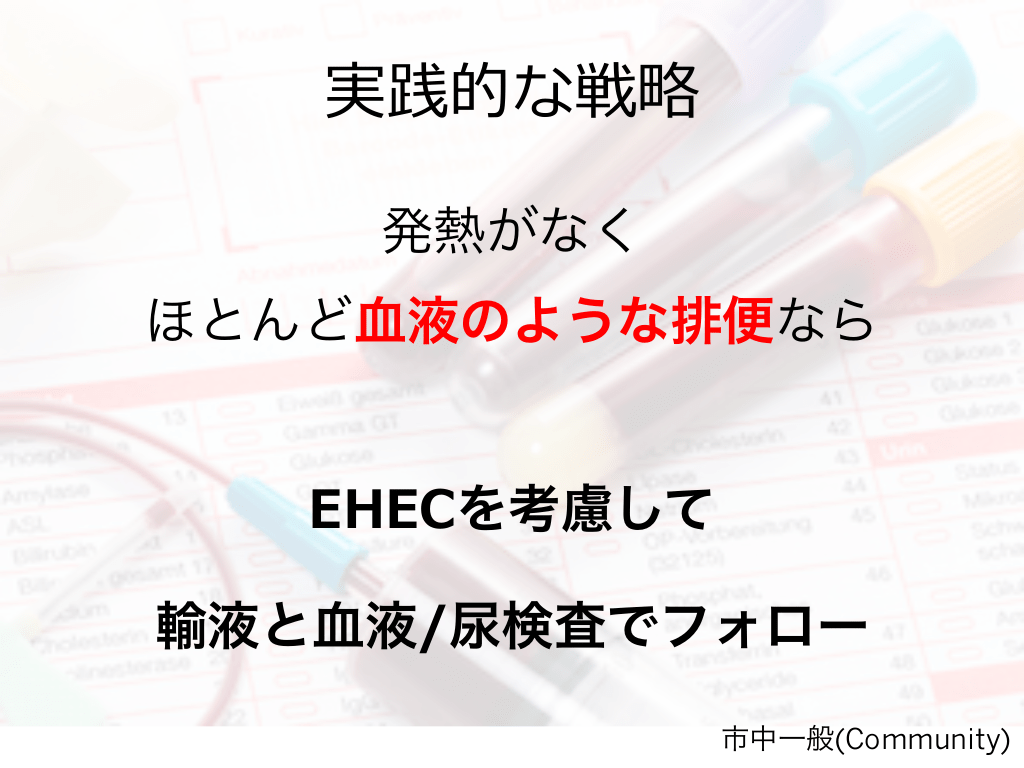 #48. 実践的な戦略 発熱がなく ほとんど血液のような排便なら EHECを考慮して 輸液と血液/尿検査でフォロー 市中一般(Community)