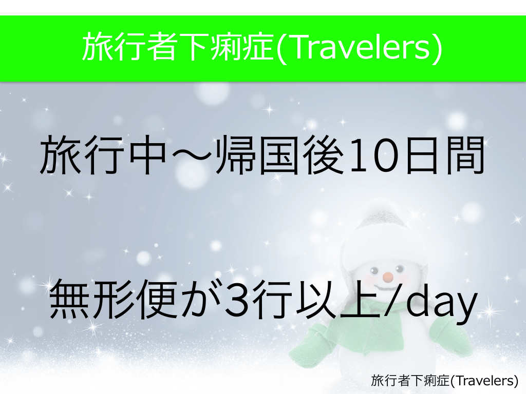 #49. 旅⾏者下痢症(Travelers) 旅行中〜帰国後10日間 無形便が3行以上/day 旅行者下痢症(Travelers)