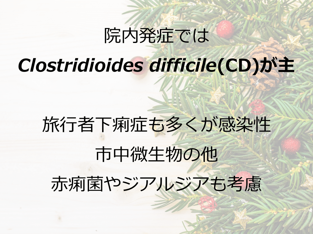 #5. 院内発症では Clostridioides difficile(CD)が主 旅⾏者下痢症も多くが感染性 市中微⽣物の他 ⾚痢菌やジアルジアも考慮