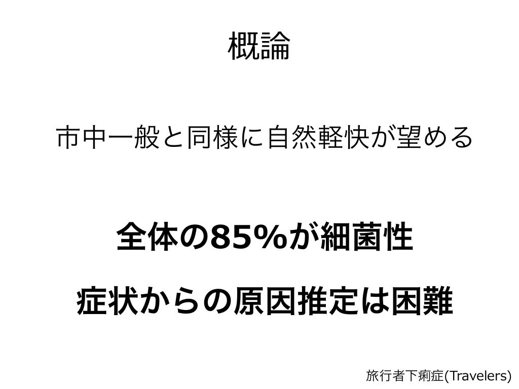 #50. 概論 市中一般と同様に自然軽快が望める 全体の85%が細菌性 症状からの原因推定は困難 旅行者下痢症(Travelers)
