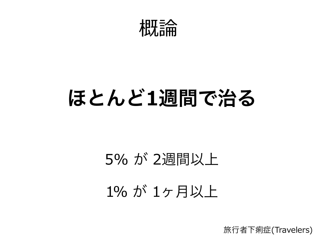 #51. 概論 ほとんど1週間で治る 5% が 2週間以上 1% が 1ヶ月以上 旅行者下痢症(Travelers)