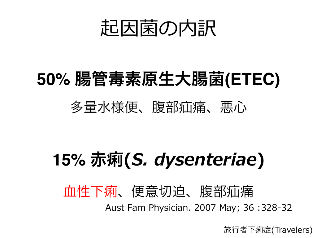 #52. 起因菌の内訳 50% 腸管毒素原生大腸菌(ETEC 多量水様便、腹部疝痛、悪心 15% 赤痢(S. dysenteriae) 血性下痢、便意切迫、腹部疝痛 Aust Fam Physician. 2007 May; 36 :328-32 ) 旅行者下痢症(Travelers)