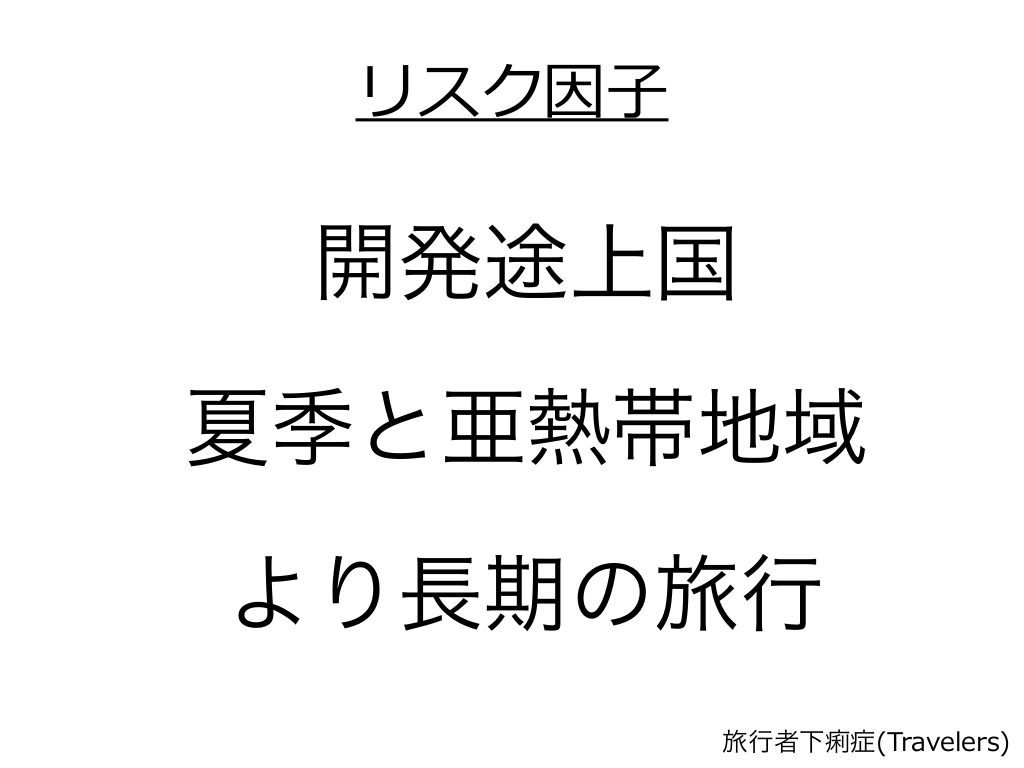 #55. リスク因⼦ 開発途上国 夏季と亜熱帯地域 より長期の旅行 旅行者下痢症(Travelers)