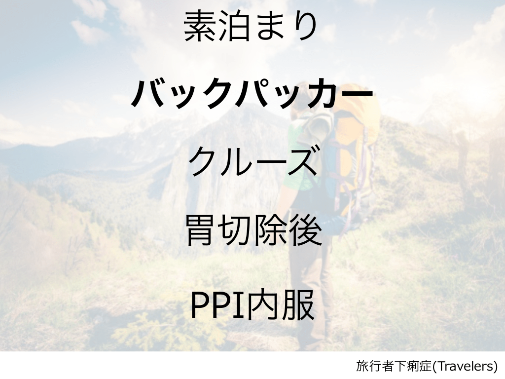#56. 素泊まり バックパッカー クルーズ 胃切除後 PPI内服 旅行者下痢症(Travelers)