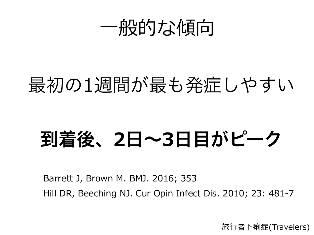 #58. ⼀般的な傾向 最初の1週間が最も発症しやすい 到着後、2日〜3日目がピーク Barrett J, Brown M. BMJ. 2016; 353 Hill DR, Beeching NJ. Cur Opin Infect Dis. 2010; 23: 481-7 旅行者下痢症(Travelers)