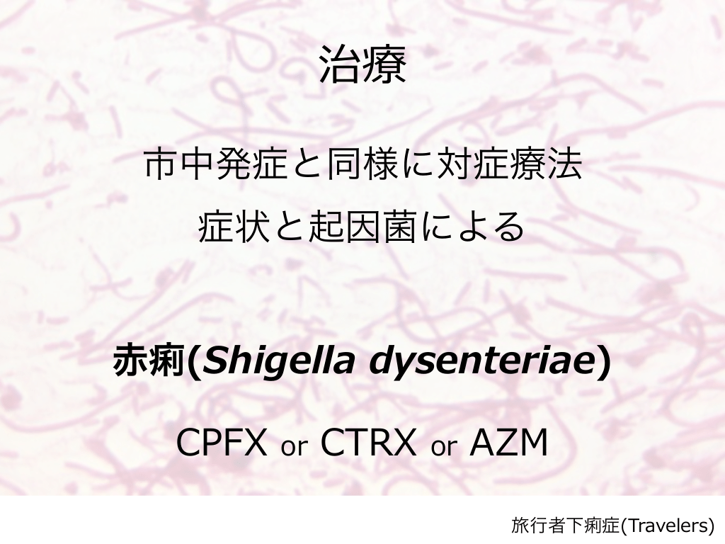 #59. 治療 市中発症と同様に対症療法 症状と起因菌による 赤痢(Shigella dysenteriae) CPFX or CTRX or AZM 旅行者下痢症(Travelers)
