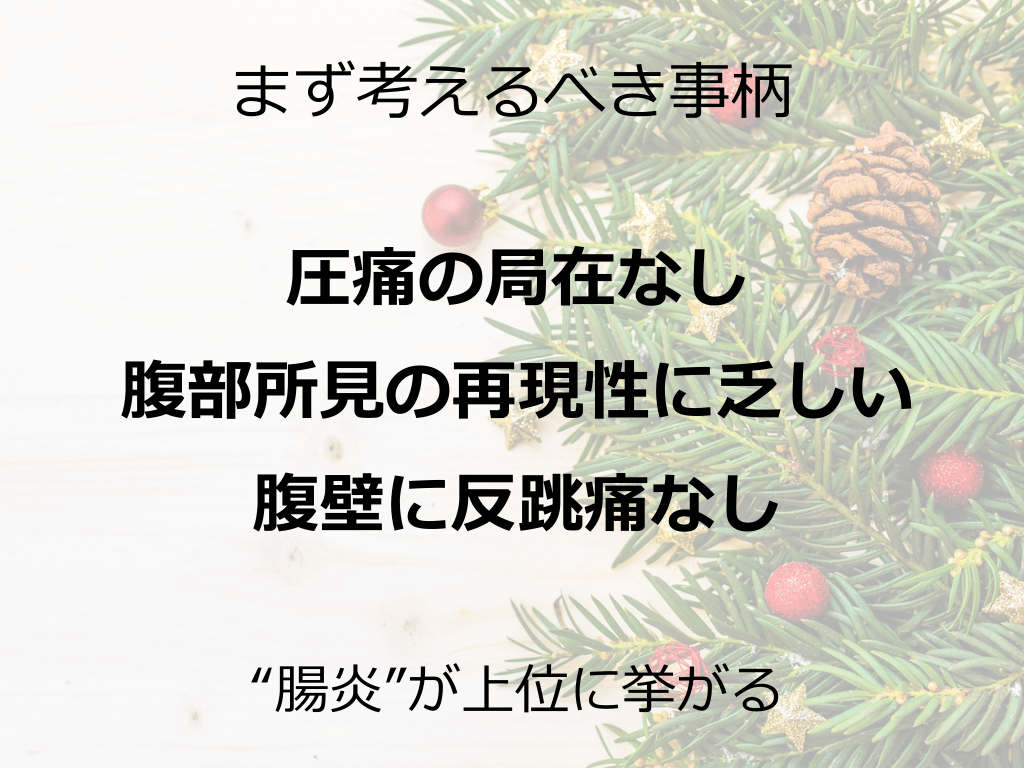 #6. まず考えるべき事柄 圧痛の局在なし 腹部所⾒の再現性に乏しい 腹壁に反跳痛なし “腸炎”が上位に挙がる