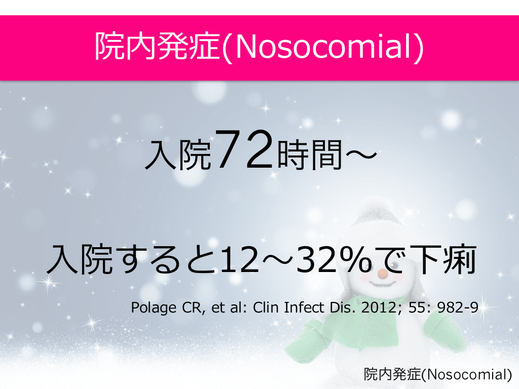 #60. 院内発症(Nosocomial) 入院72時間〜 入院すると12〜32%で下痢 Polage CR, et al: Clin Infect Dis. 2012; 55: 982-9 院内発症(Nosocomial)