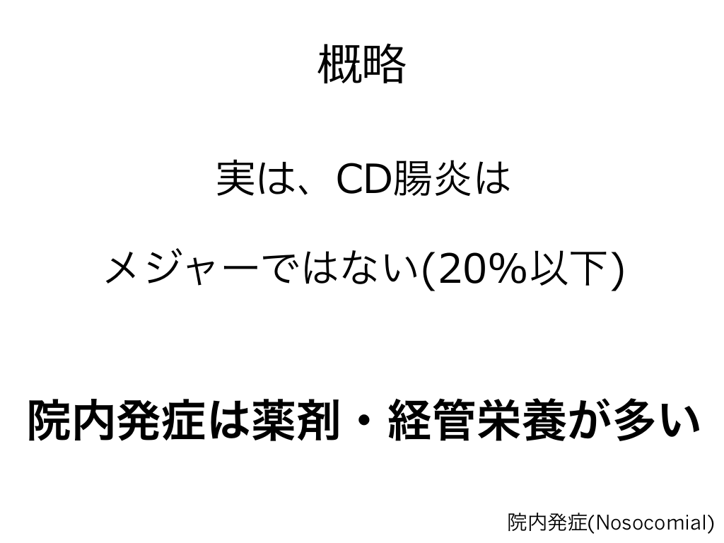 #61. 概略 実は、CD腸炎は メジャーではない(20%以下) 院内発症は薬剤・経管栄養が多い 院内発症(Nosocomial)