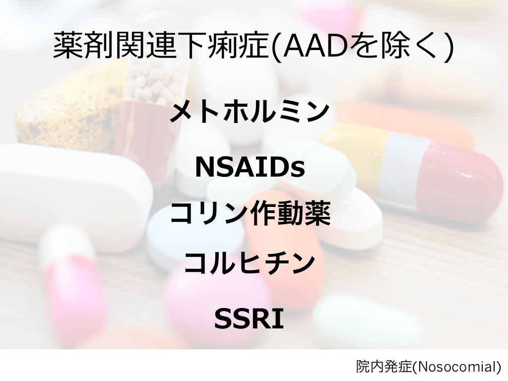 #62. 薬剤関連下痢症(AADを除く) メトホルミン NSAIDs コリン作動薬 コルヒチン SSRI 院内発症(Nosocomial)