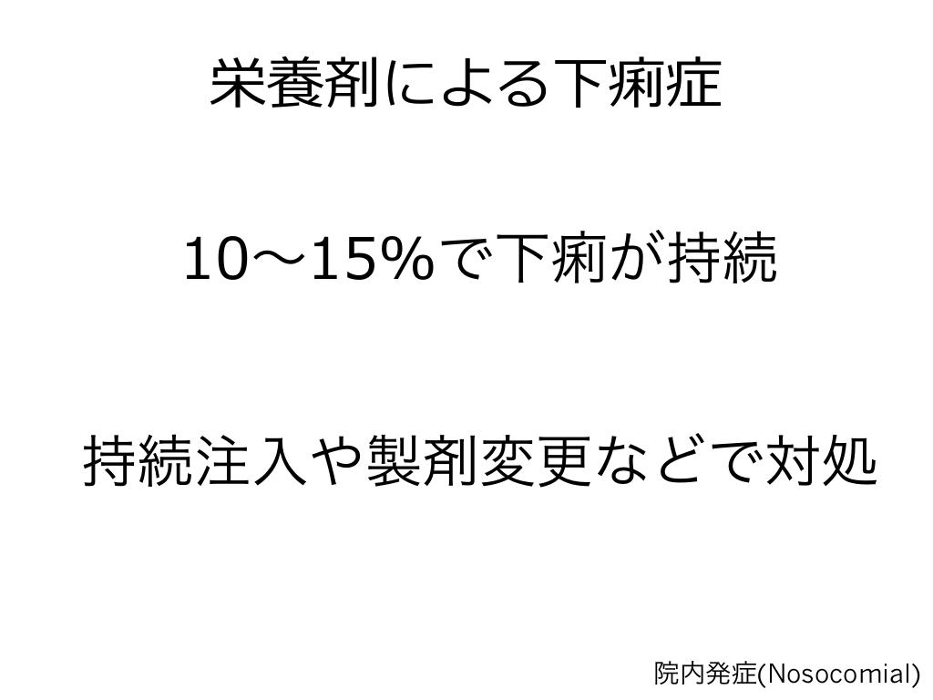 #64. 栄養剤による下痢症 10〜15%で下痢が持続 持続注入や製剤変更などで対処 院内発症(Nosocomial)