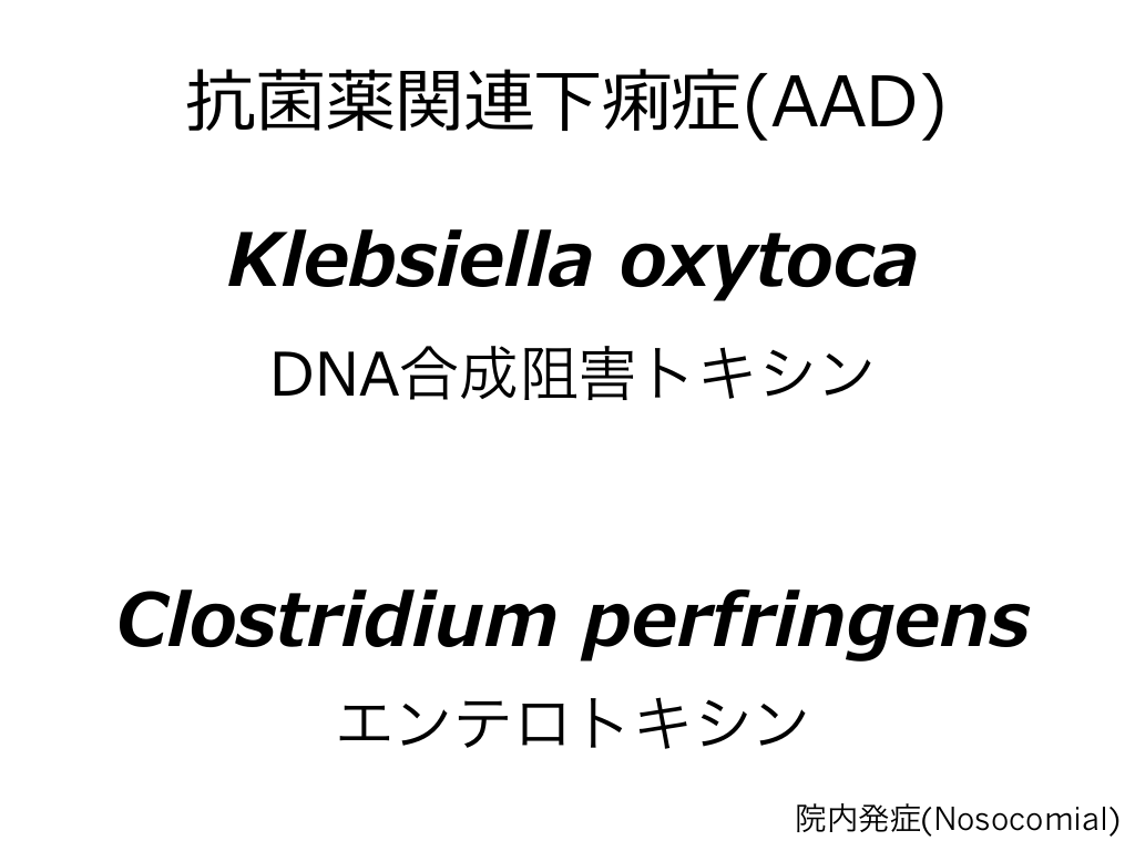 #66. 抗菌薬関連下痢症(AAD) Klebsiella oxytoca DNA合成阻害トキシン Clostridium perfringens エンテロトキシン 院内発症(Nosocomial)