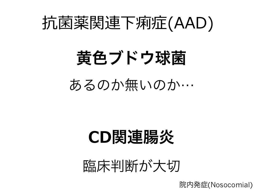 #67. 抗菌薬関連下痢症(AAD) 黄色ブドウ球菌 あるのか無いのか… CD関連腸炎 臨床判断が大切 院内発症(Nosocomial)