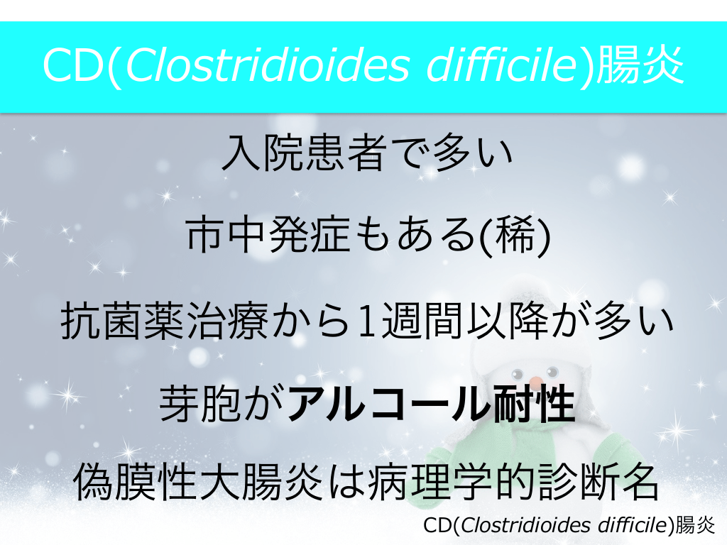 #68. CD(Clostridioides difficile)腸炎 入院患者で多い 市中発症もある(稀) 抗菌薬治療から1週間以降が多い 芽胞がアルコール耐性 偽膜性大腸炎は病理学的診断名 CD(Clostridioides difficile)腸炎