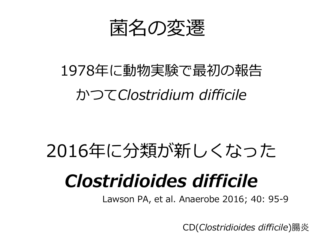 #69. 菌名の変遷 1978年に動物実験で最初の報告 かつてClostridium difficile 2016年に分類が新しくなった Clostridioides difficile Lawson PA, et al. Anaerobe 2016; 40: 95-9 CD(Clostridioides difficile)腸炎