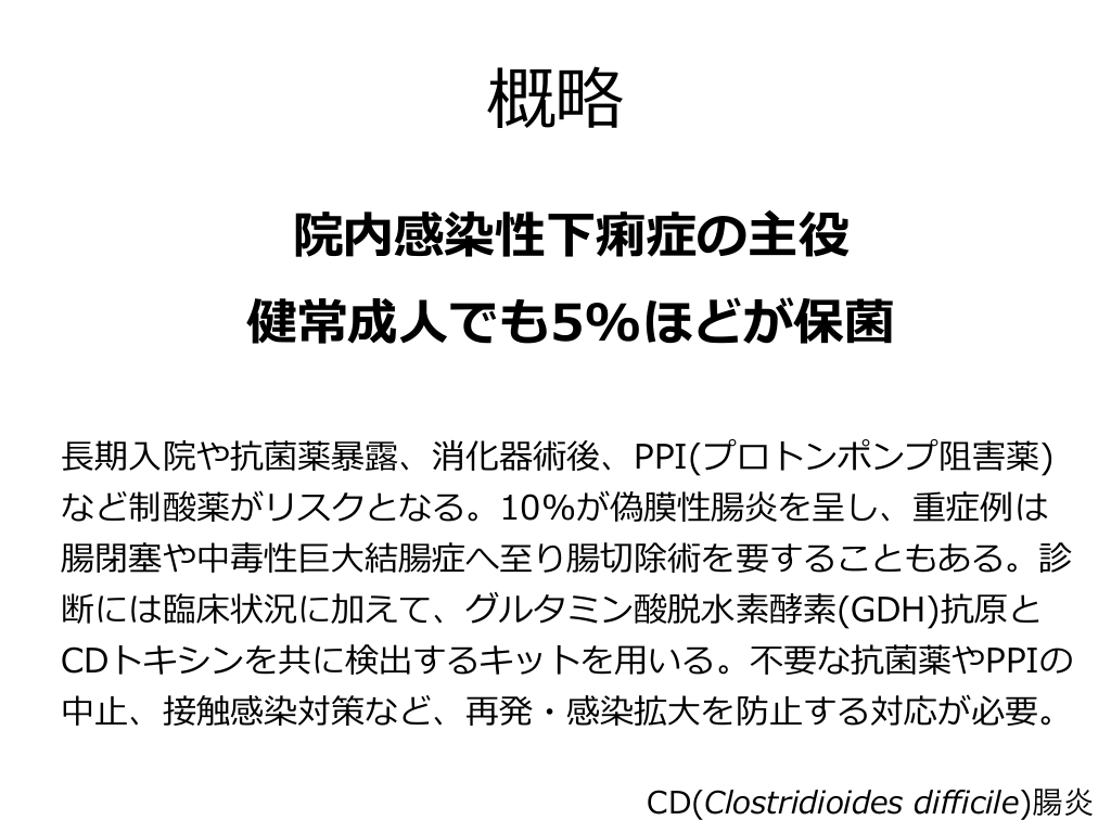#70. 概略 院内感染性下痢症の主役 健常成⼈でも5%ほどが保菌 ⻑期⼊院や抗菌薬暴露、消化器術後、PPI(プロトンポンプ阻害薬) など制酸薬がリスクとなる。10%が偽膜性腸炎を呈し、重症例は 腸閉塞や中毒性巨⼤結腸症へ⾄り腸切除術を要することもある。診 断には臨床状況に加えて、グルタミン酸脱⽔素酵素(GDH)抗原と CDトキシンを共に検出するキットを⽤いる。不要な抗菌薬やPPIの 中⽌、接触感染対策など、再発・感染拡⼤を防⽌する対応が必要。 CD(Clostridioides difficile)腸炎