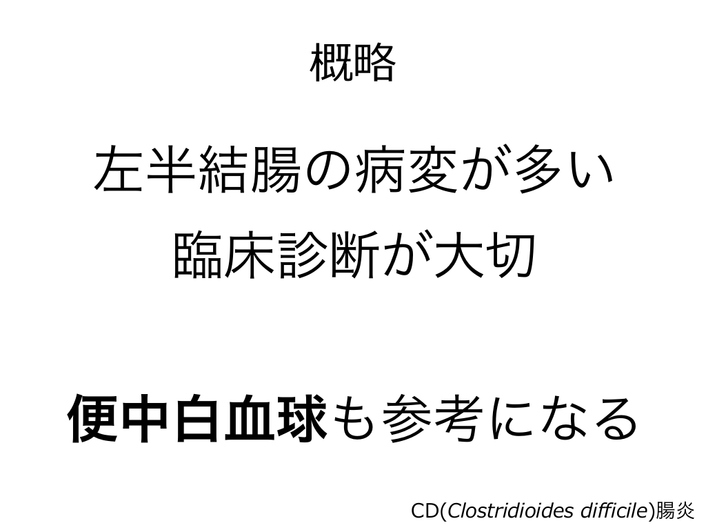 #71. 概略 左半結腸の病変が多い 臨床診断が大切 便中白血球も参考になる CD(Clostridioides difficile)腸炎