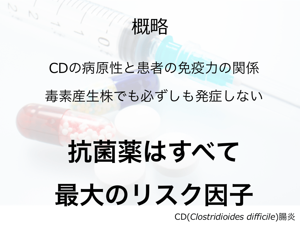 #72. 概略 CDの病原性と患者の免疫力の関係 毒素産生株でも必ずしも発症しない 抗菌薬はすべて 最大のリスク因子 CD(Clostridioides difficile)腸炎