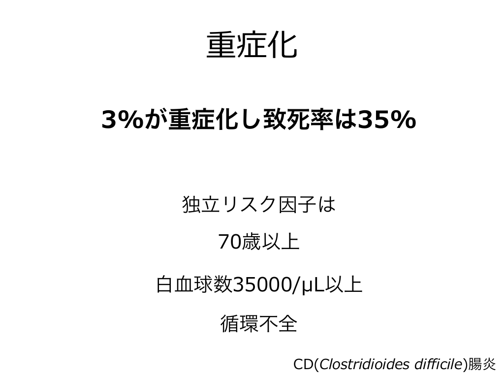 #73. 重症化 3%が重症化し致死率は35% 独立リスク因子は 70歳以上 白血球数35000/μL以上 循環不全 CD(Clostridioides difficile)腸炎
